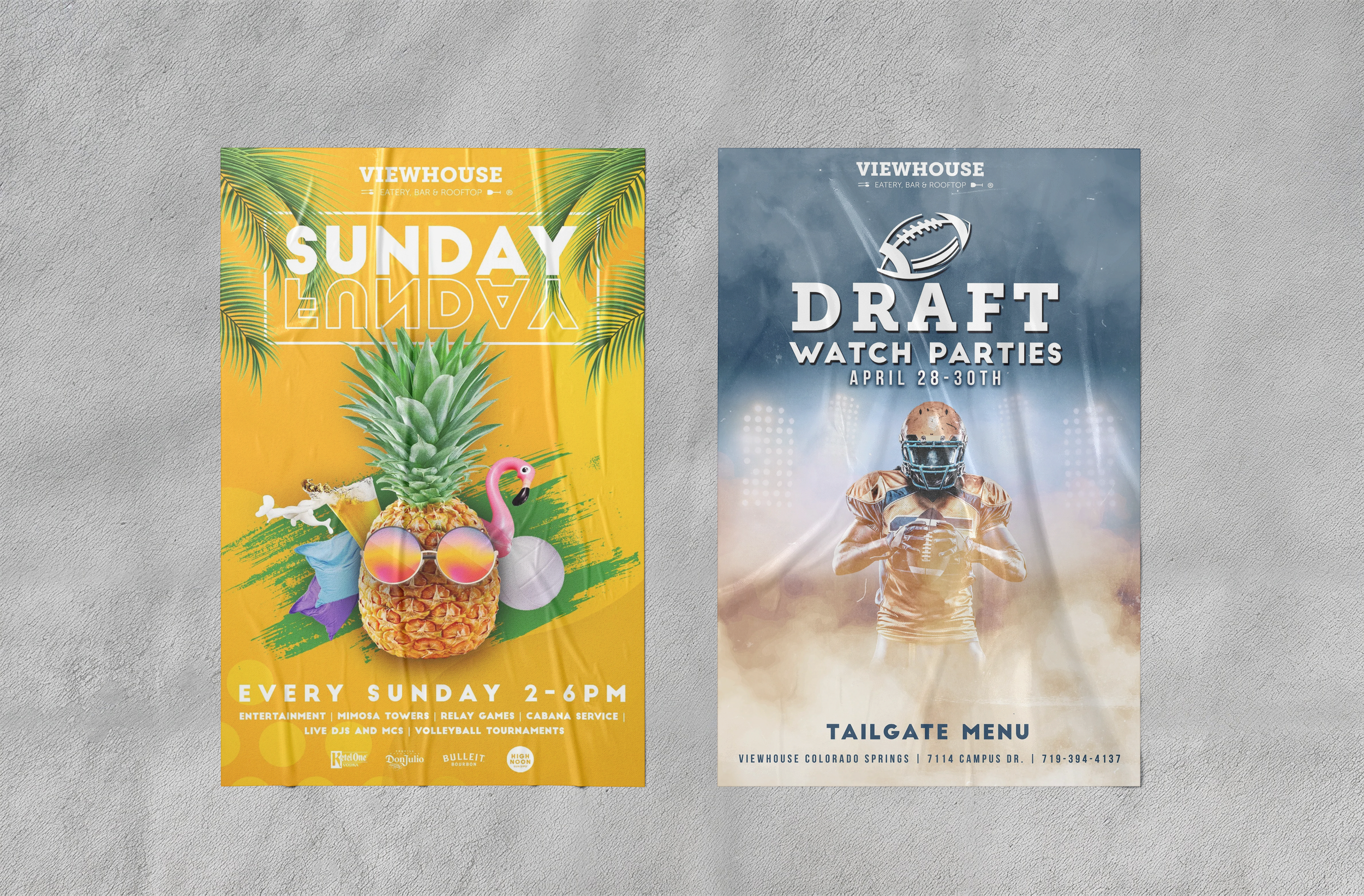 A series of event posters designed to promote ViewHouse programming and attract a young, social audience. The visuals highlight the brand’s energetic personality while encouraging guests to gather for sports, food, drinks, and community-driven events.